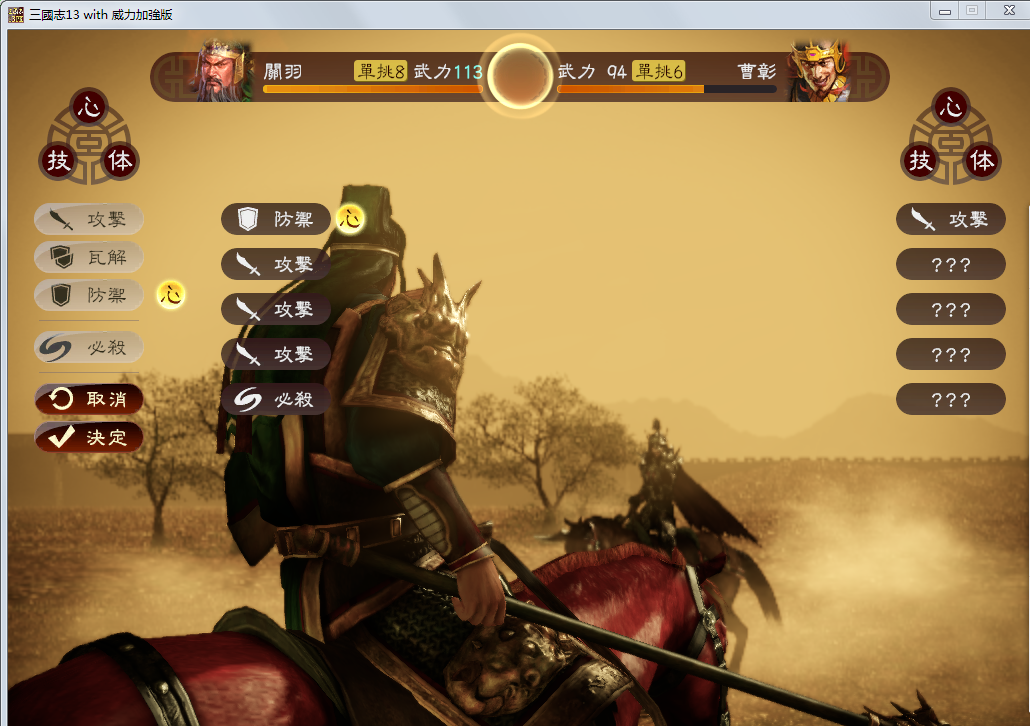 择了剧本之后,会问是否加入新武将。新武将这里包括完成练习模式送的古代武将和玩家自创的武将(记得不错的话,通关一次之后,新武将的能力可以随便设定,全100都可以,之前似乎很渣)用不用新武将,完全是你的爱好了,不多解释。